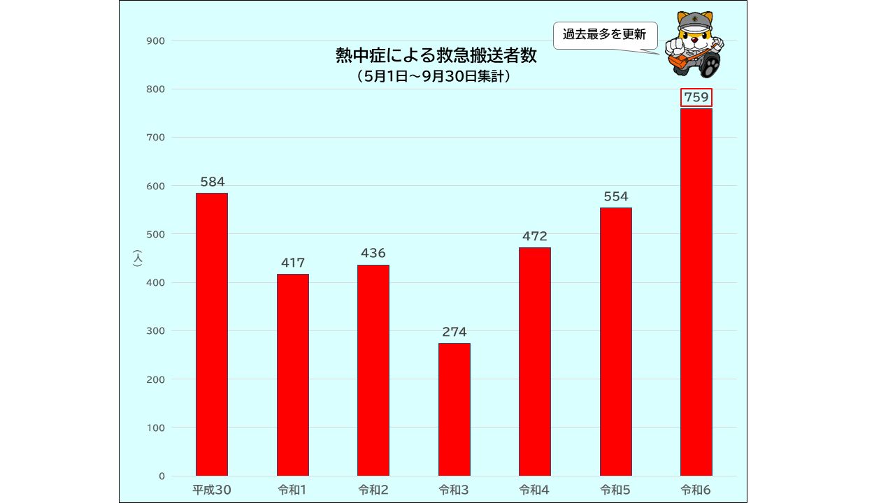 令和6年中における川崎市内の熱中症による救急搬送者数は759人となり、過去最高を更新しました。(5月1日~9月30日集計)