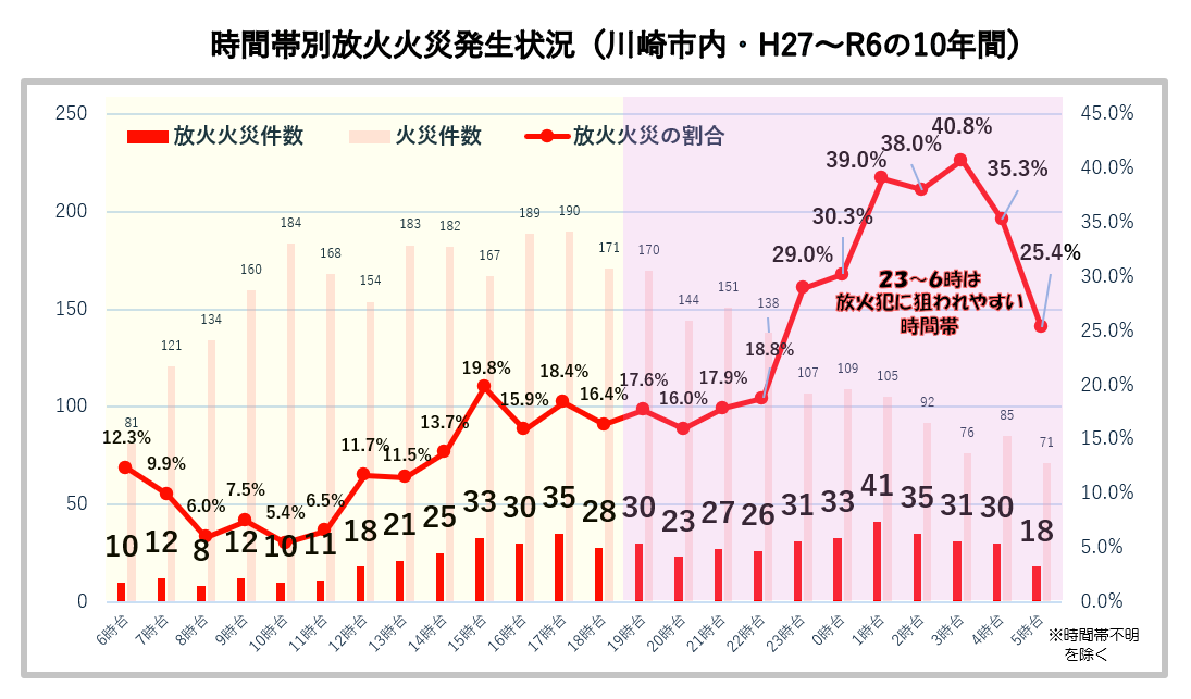 火災件数に占める放火の割合をみると、23~6時の時間帯が特に高い傾向がありますので、人目に付きにくい時間帯に放火犯に狙われないような環境づくりが大切です。