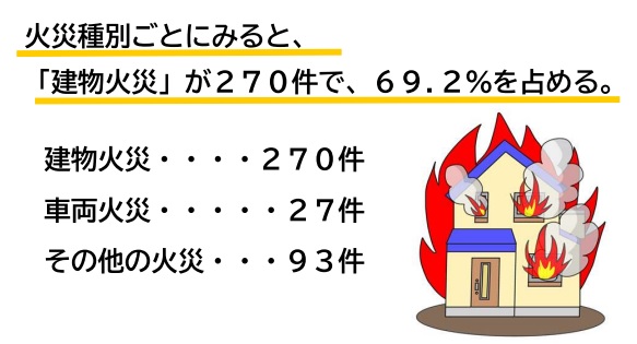 火災件数を建物、車両及びその他の火災に分類すると、建物火災が270件と最も多く、全体の69.2%を占めています。