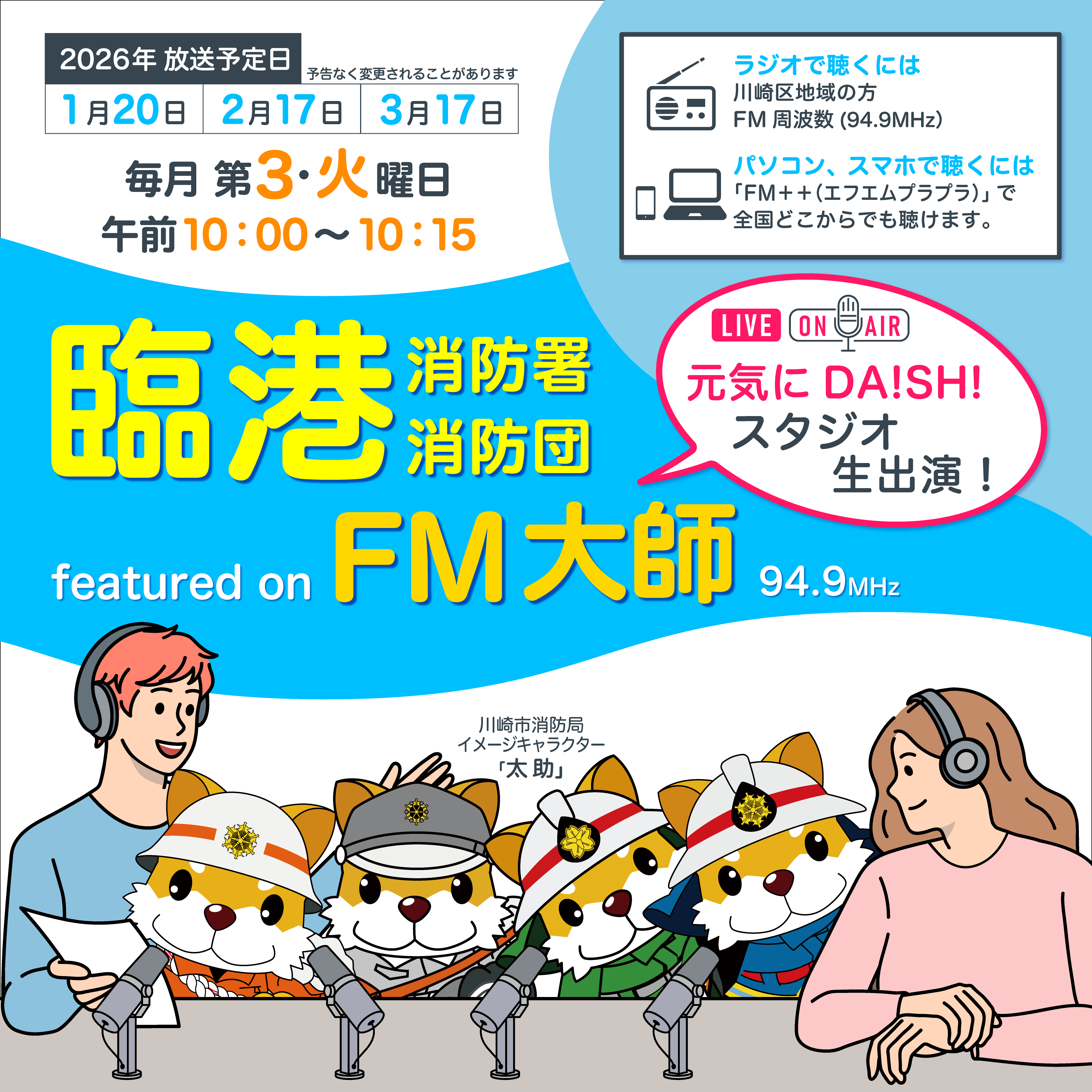 臨港消防署の職員・臨港消防団の団員が、コミュニティーラジオFM大師の『元気にDA!SH!』に生出演し、さまざまな情報をお届けします。