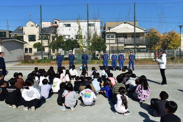 令和7年12月12日金曜日、川崎市立藤崎小学校の「みんなが消防士」に臨港消防団第1分団が参加しました。