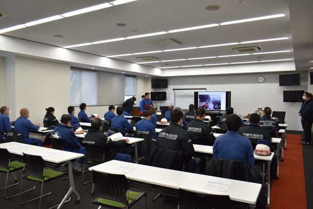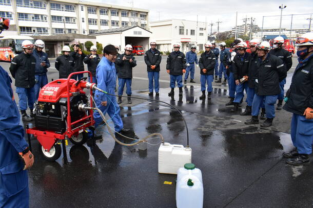 令和7年12月6日土曜日、川崎市消防訓練センターで臨港・川崎・幸・中原の各消防団合同で、消火活動で使用する可搬ポンプの取扱研修を受講しました。