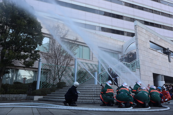 高津消防団、高津ジュニアハイスクール、消防隊による一斉放水