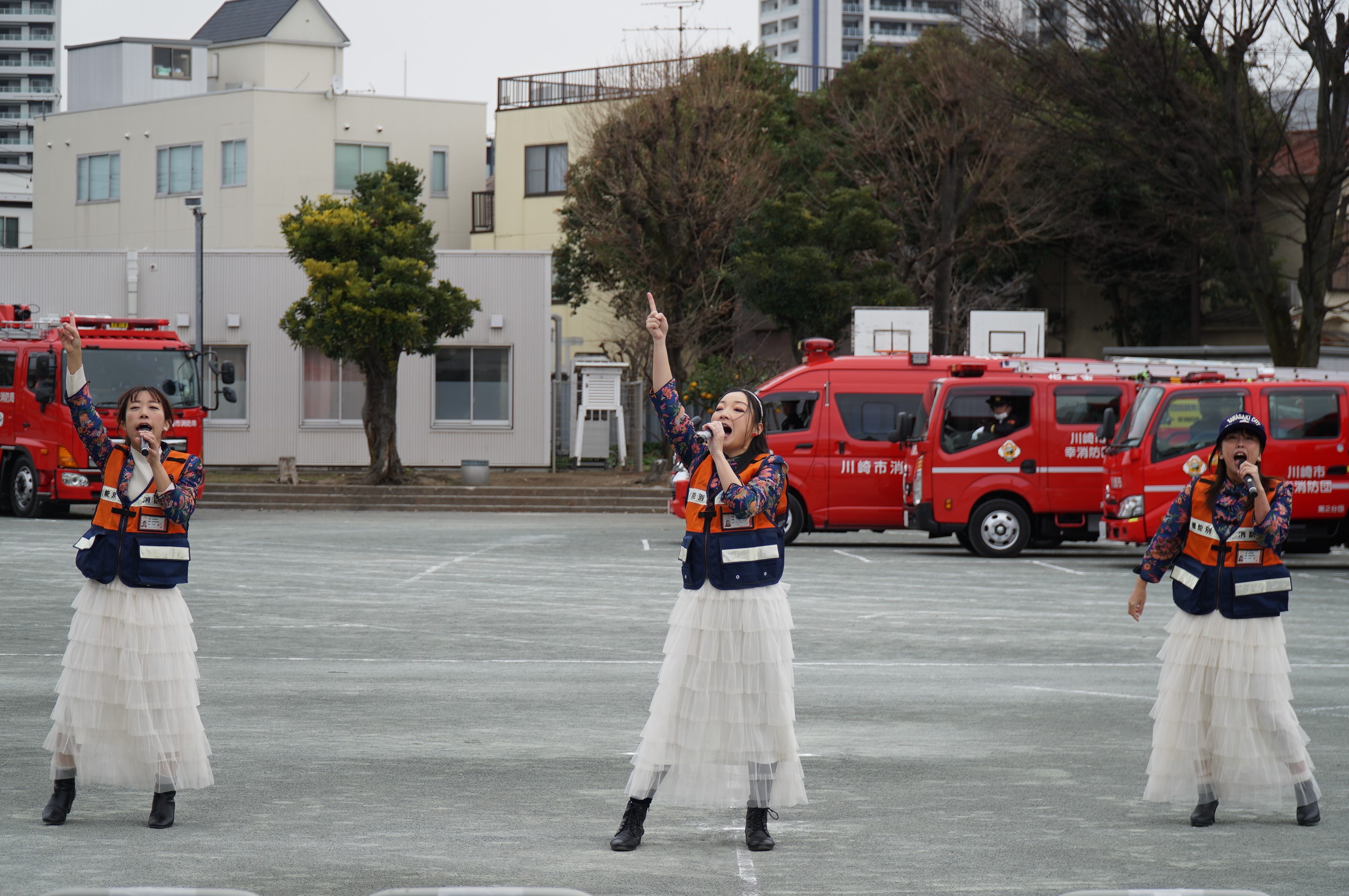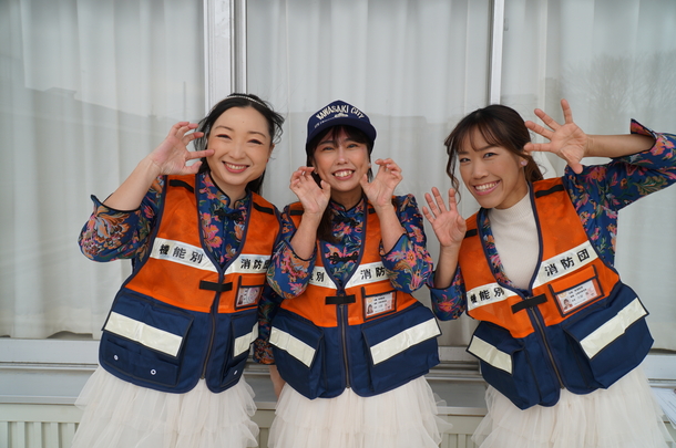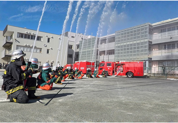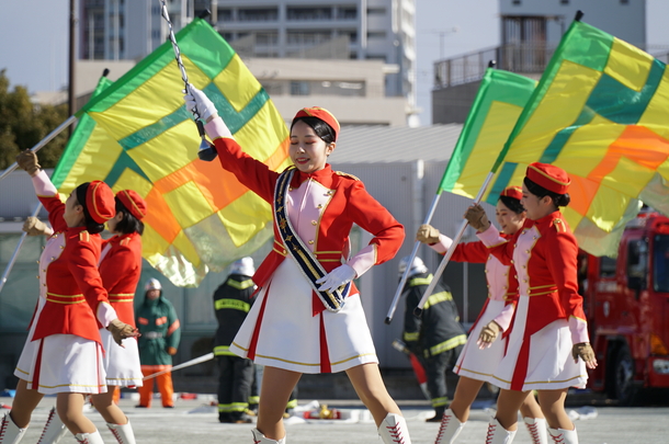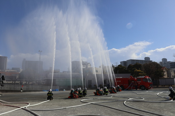 第二部は、屋外において、消防団・消防職員による車両の分列行進、カラーガード隊「レッド・ウイングス」によるドリル演技、機能別消防団員でもある自称・夢見ヶ崎動物公園専属アイドルGABUさんによるパフォーマンス、消防演技が披露され、最後に消防団・消防職員による一斉放水で締めくくられました。