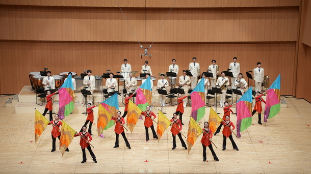 音楽隊員の力強い演奏に、カラーガード隊員の思いをのせ、「オペラ座の怪人」、映画「バーレスク」より「ショー・ミー・ハウ・ユー・バーレスク」、ディズニー実写映画「アラジン」より「スピーチレス~心の声」、ミュージカル「レ・ミゼラブル」より「ワン・デイ・モア」の4曲を披露しました。