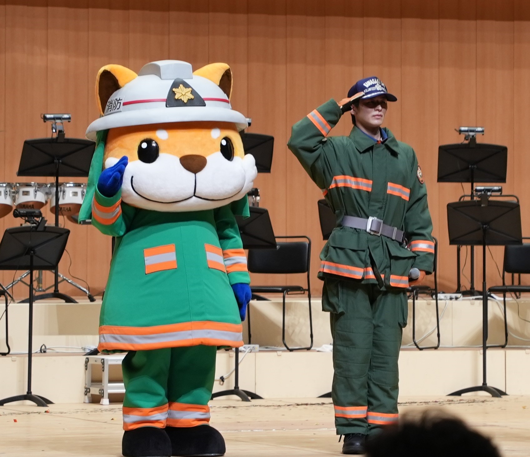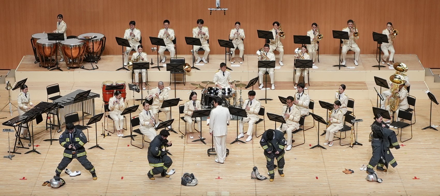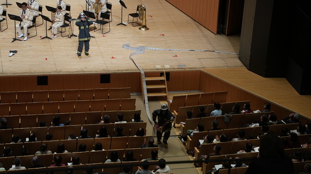 また、現役消防士兼音楽隊員3名と防火衣の訓練など行ったことのないカラーガード隊員1名の計4名による「消防早着替え選手権」を行い、客席までホースの延長も行うなど消防をより身近に感じていただきました。