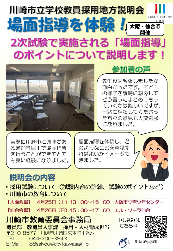 川崎市の教育(令和8年度からの「新教育プラン」など)や求める教師像、試験の概要について説明するほか、みなさんの御質問にもお答えしますので、是非、御参加ください。