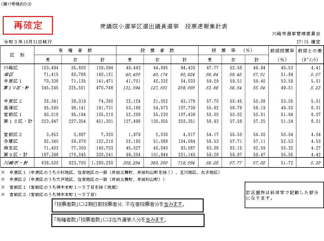 令和3年10月31日執行 衆議院小選挙区選出議員選挙 投票(確定)