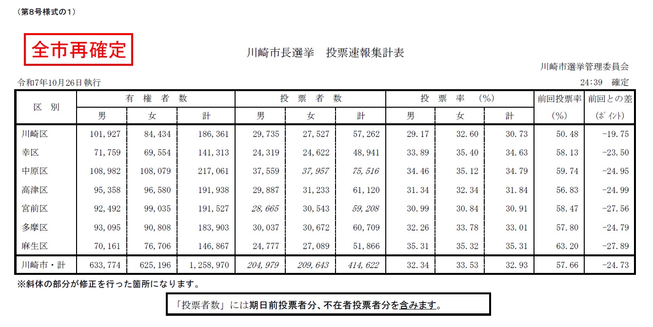 令和7年10月26日執行 川崎市長選挙 投票(確定)