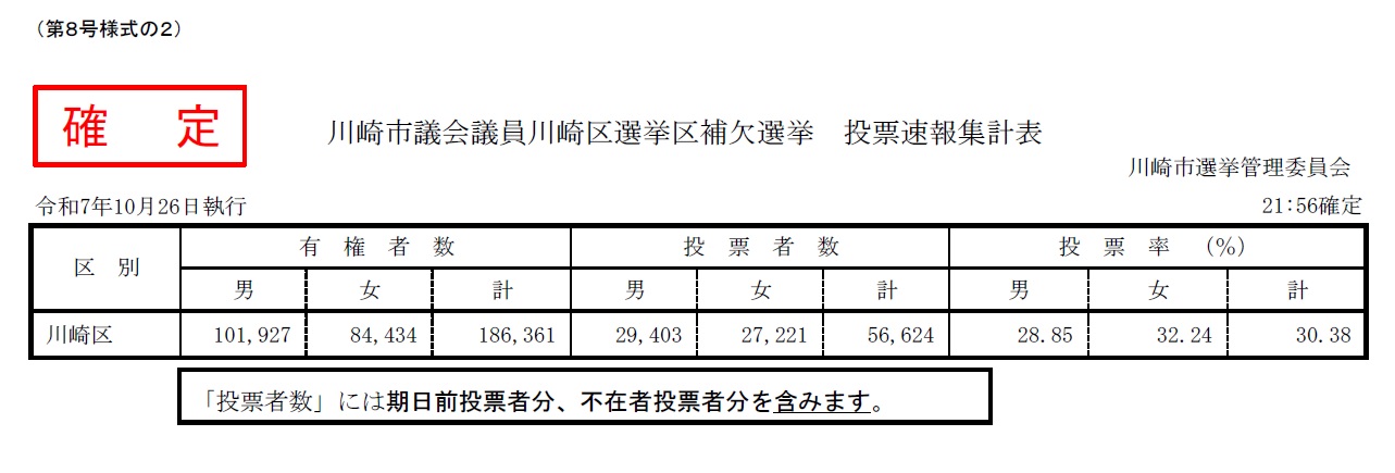 令和7年10月26日 川崎市議会議員川崎区選挙区補欠選挙 投票(確定)