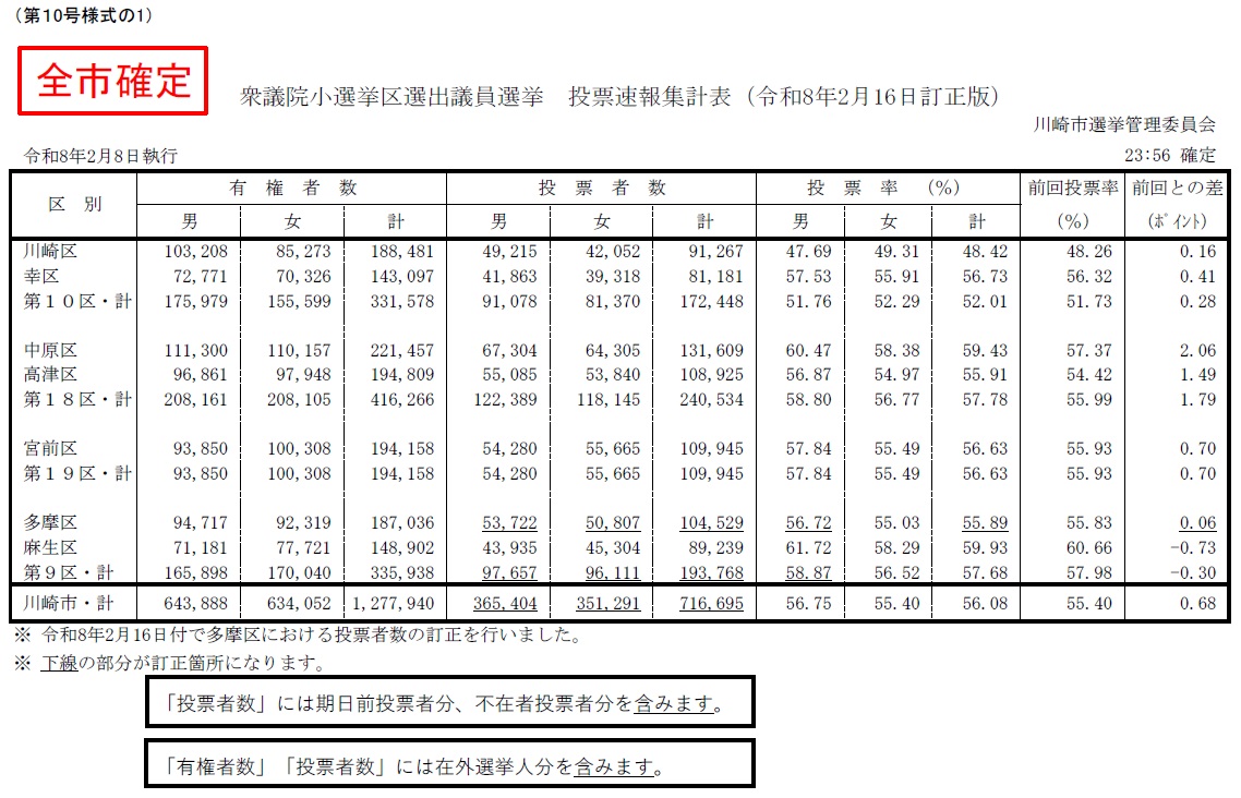 令和8年2月8日執行 衆議院小選挙区選出議員選挙 投票(確定)