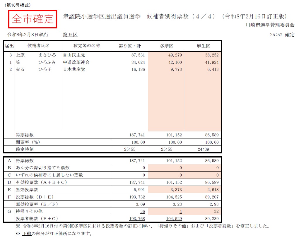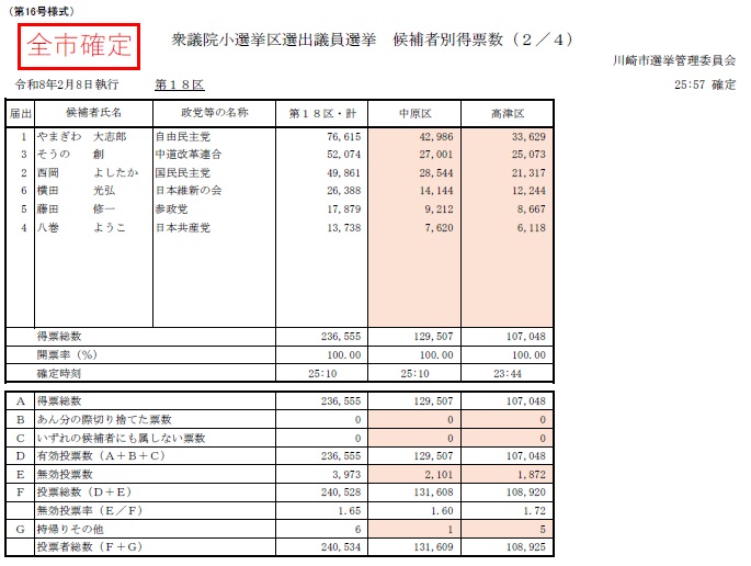 令和8年2月8日執行 衆議院小選挙区選出議員選挙 開票(確定)