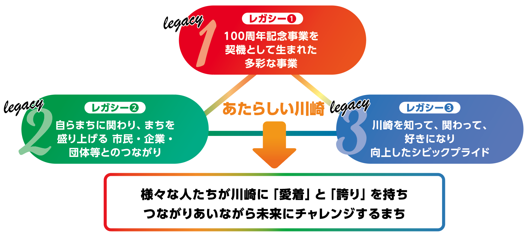 向上したシビックプライド」をレガシーとして取組を推進し、様々な人たちが川崎に「愛着」と「誇り」を持ち、