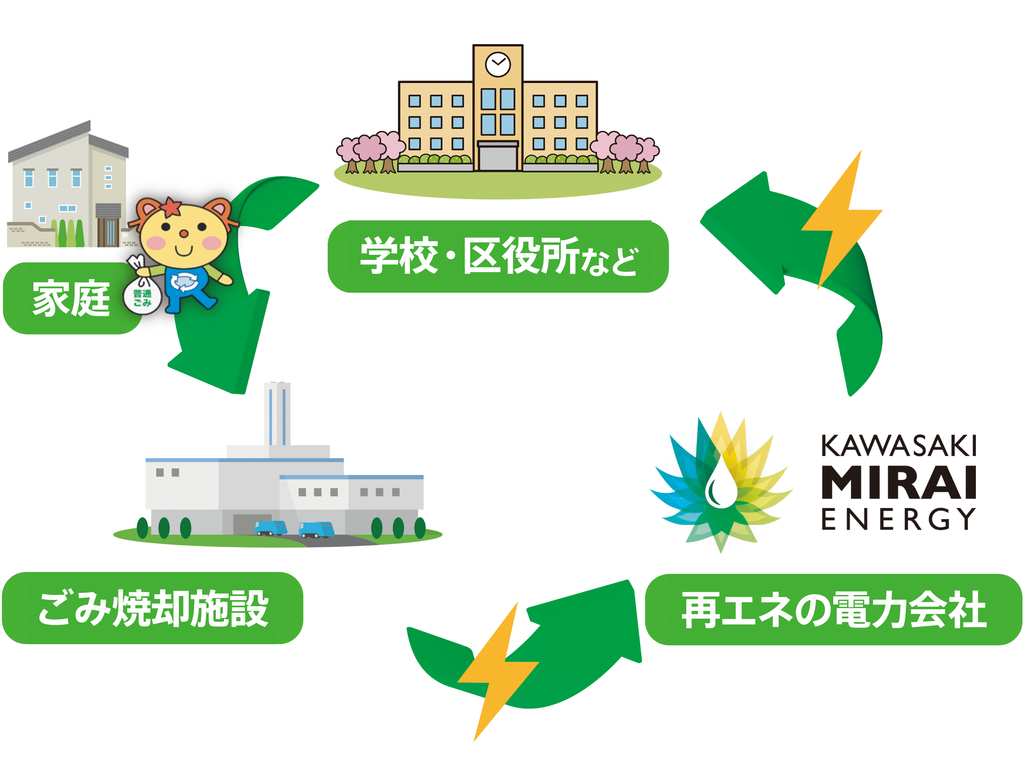 令和5(2023)年10月には再生可能エネルギーの地産地消などを目指す「川崎未来エナジー株式会社」を設立し、令和6(2024)年4月から、市内で排出される普通ごみを燃やした際の熱を利用 して発電した「川崎産グリーン電力」を市立学校などの公共施設に供給しています。 現在、再エネ100%電力を利用する施設を順次拡大しています。
