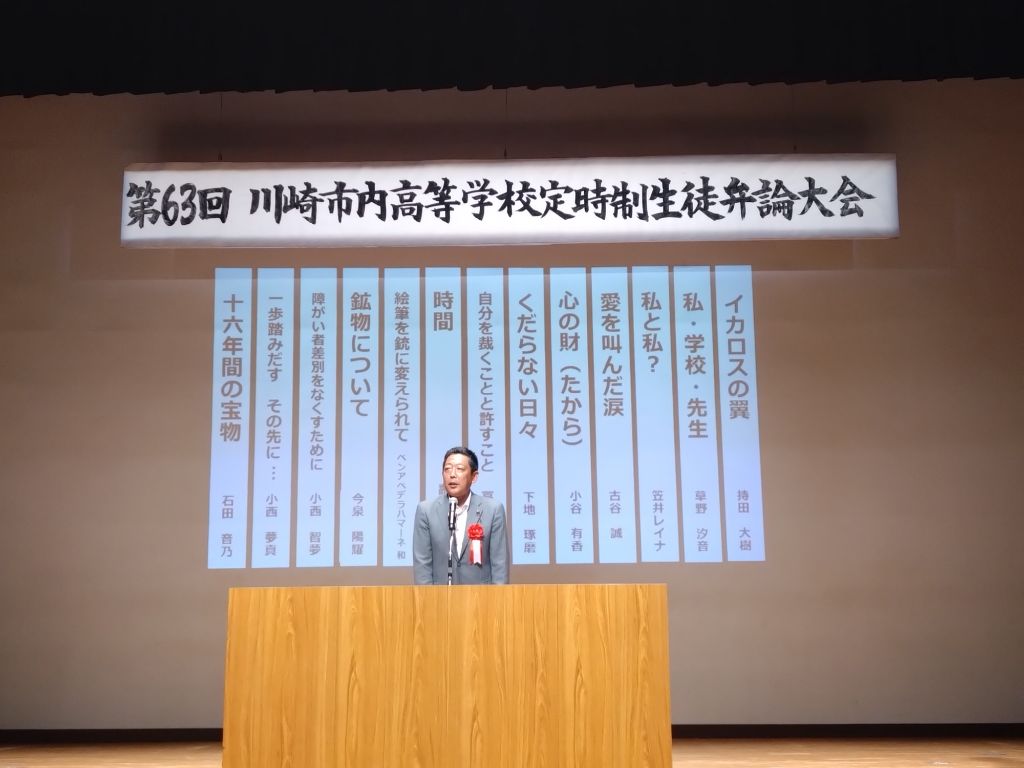 9月17日(水)、「第63回川崎市内高等学校定時制生徒弁論大会」が川崎市男女共同参画センター(すくらむ21)で開催され、原議長が出席し、主催者を代表して開会に当たり挨拶を述べました。