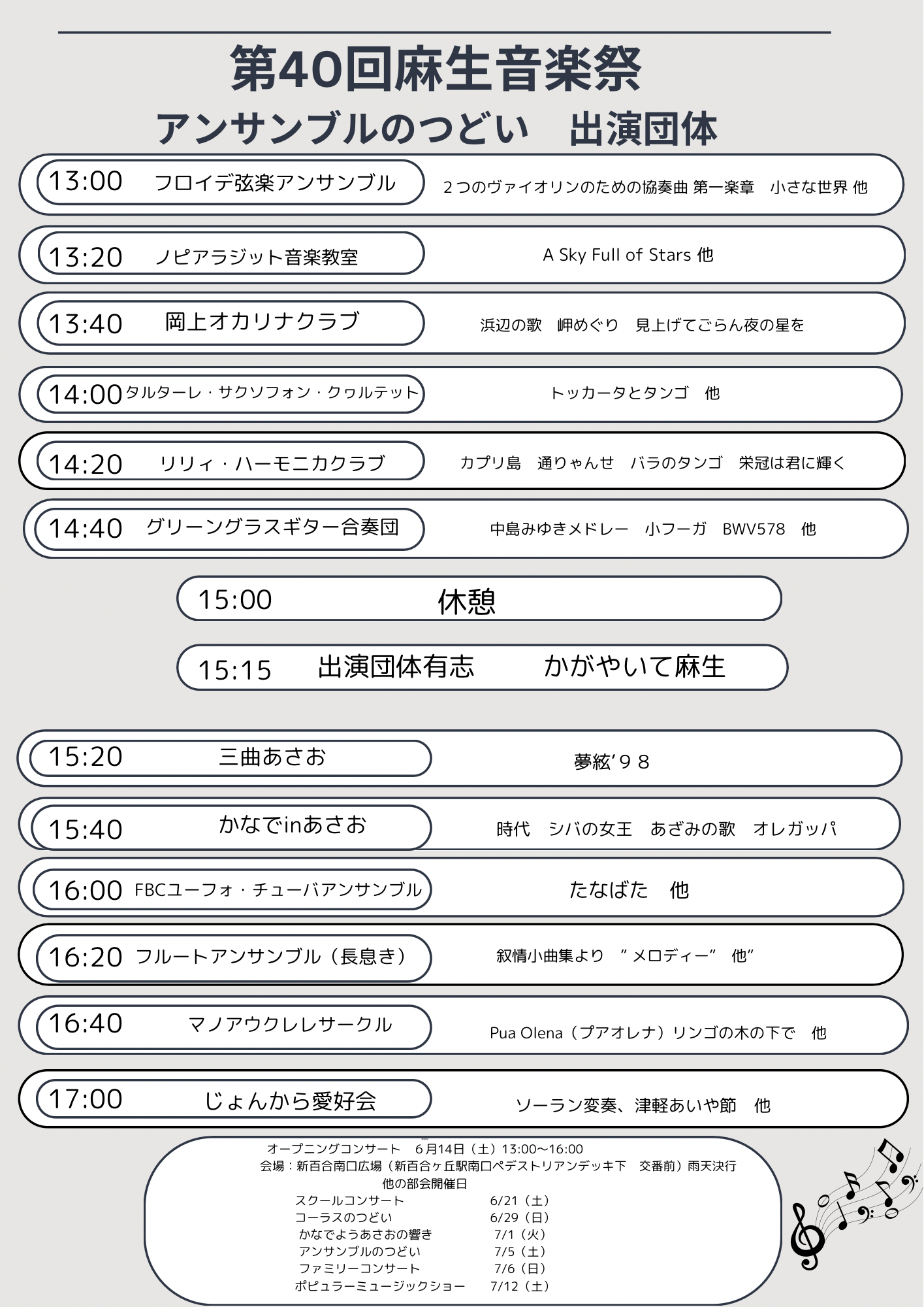 岡上オカリナクラブ / かなでinあさお / グリーングラスギター合奏団 / 三曲あさお / じょんから愛好会 / タルターレ・サクソフォン・クヮルテット / ノピアラジット音楽教室 / フルートアンサンブル「長息き」 / フロイデ弦楽アンサンブル / FBC ユーフォ・チューバアンサンブル / マノアウクレレサークル / リリィ・ハーモニカクラブ