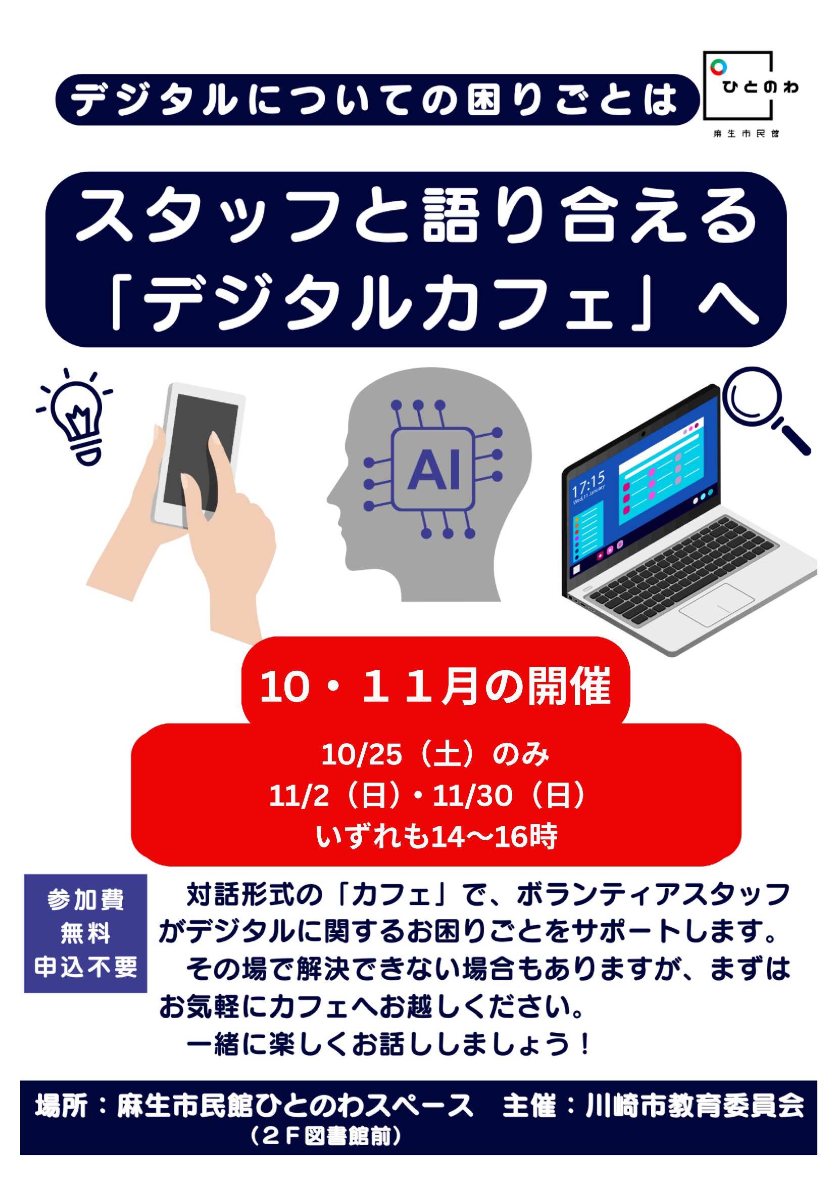 場所は麻生市民館3階ひとのわスペース(受付前)か、2階ひとのわスペース(図書館前)