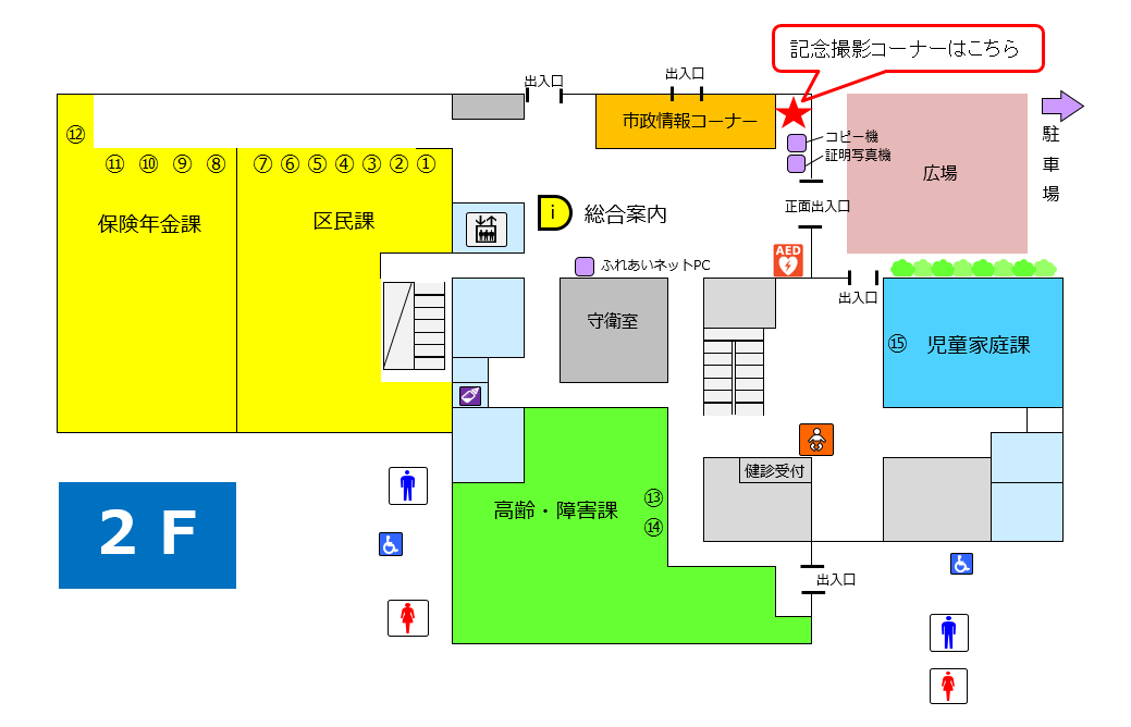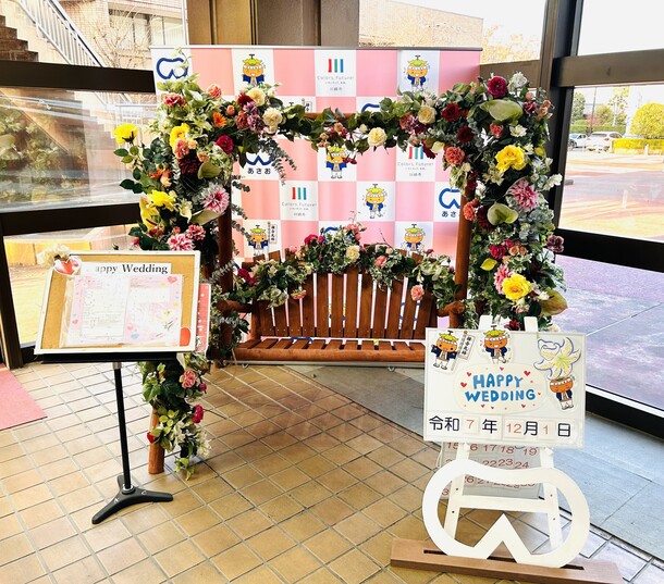 麻生区役所2階正面玄関から入ってすぐ右手に、色とりどりの花とグリーンを贅沢にあしらった記念撮影コーナーを設置しています。