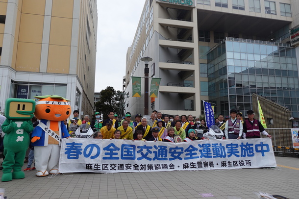 4月6日(月)午後2時30分から、新百合ヶ丘駅南口ペデストリアンデッキにて、「春の全国交通安全運動一麻生区出陣式ー」を実施しました。
