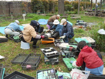 ひまわりの苗作りをするはぐくみの里 友の会の方々