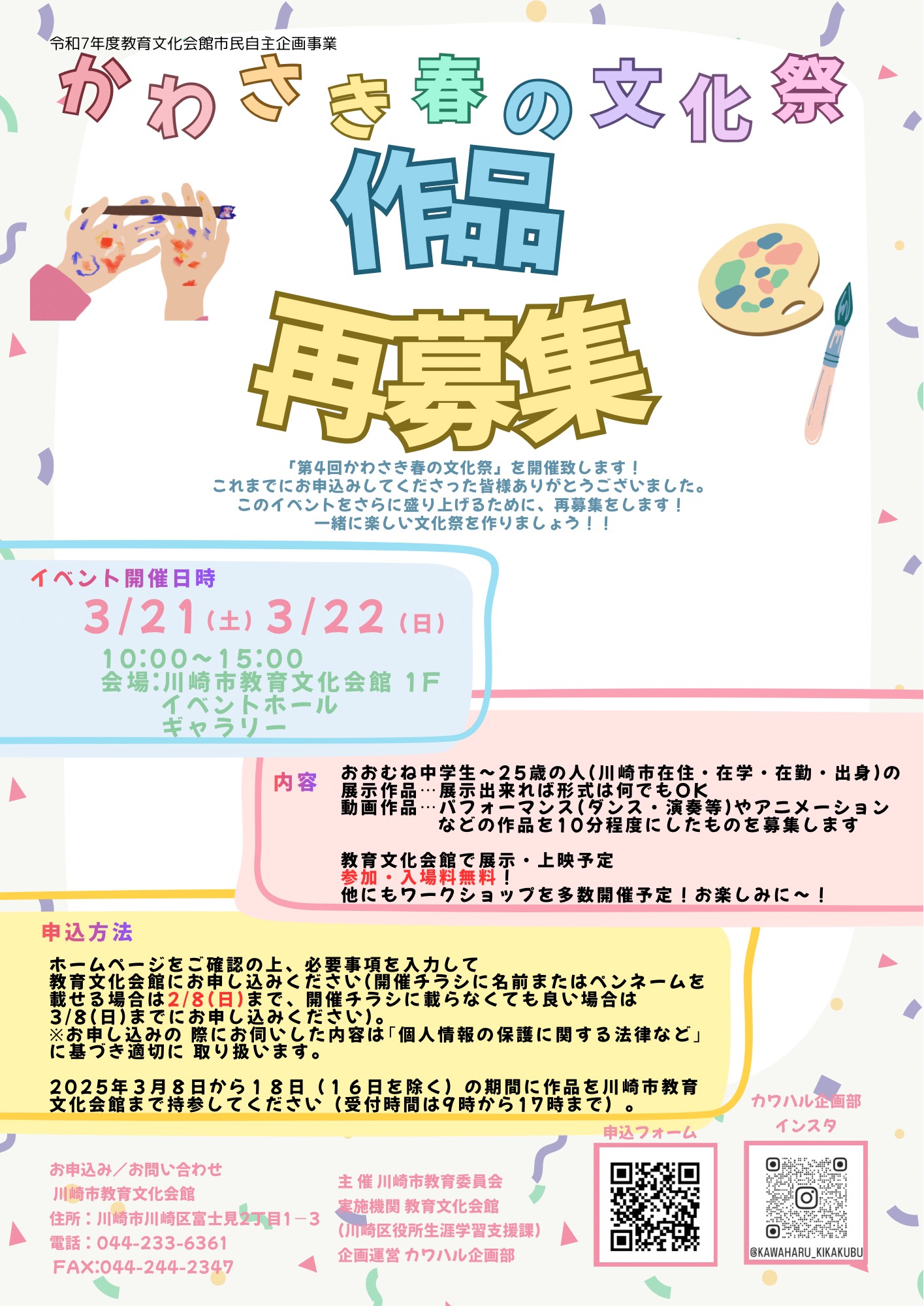郵送または持参:〒210-0011 川崎市川崎区富士見2-1-3 教育文化会館「カワハル」担当