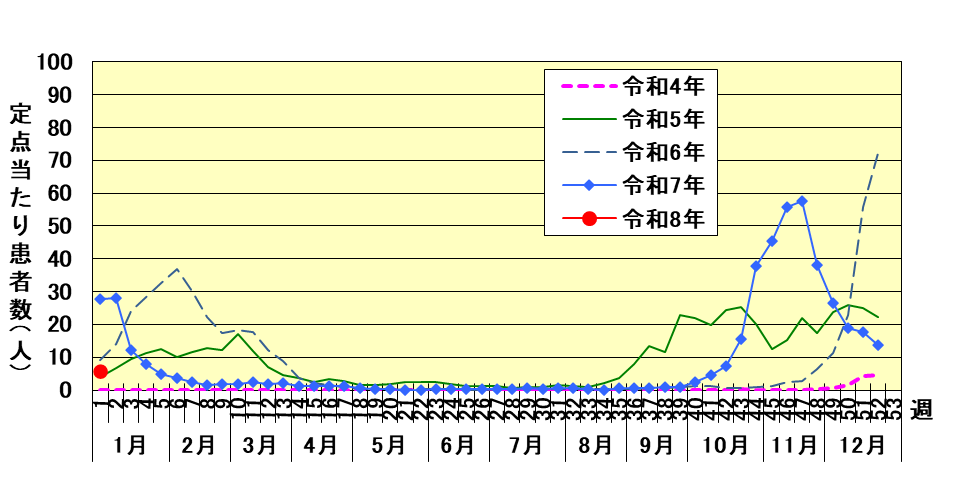 ・令和8年第1週の定点当たり報告数は5.81人でした。