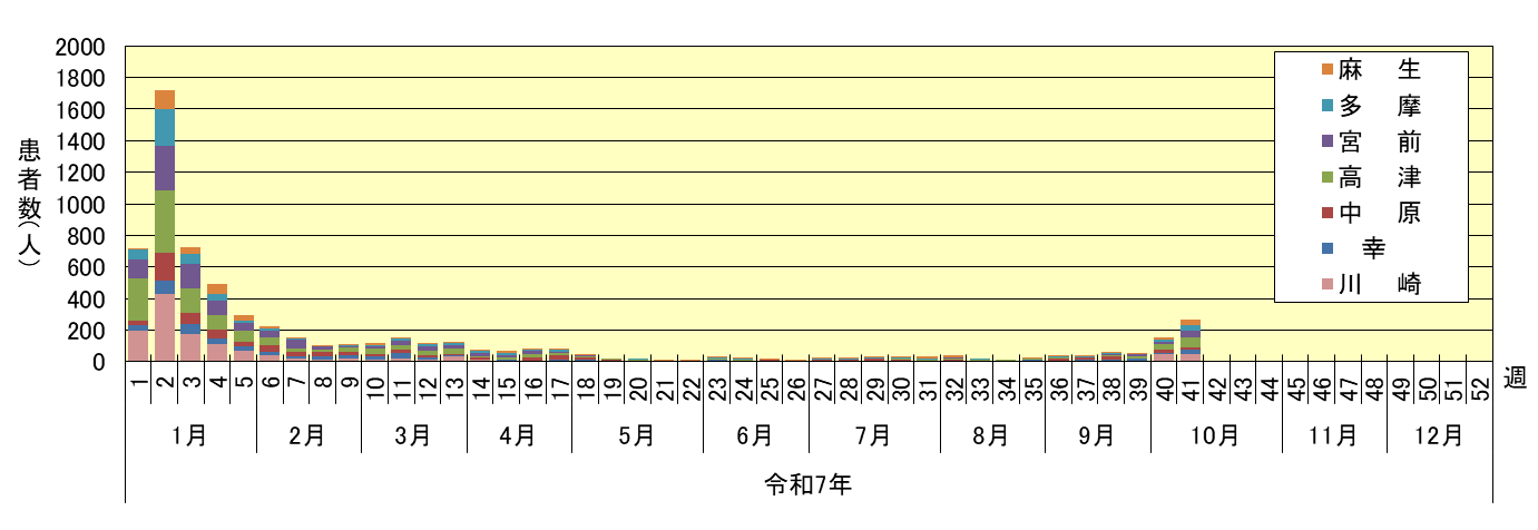 ・令和7年第41週のインフルエンザの患者報告数は269人(151)でした。区別では、川崎区45人(48)、幸区30人(9)、中原区19人(18)、高津区61人(37)、宮前区38人(17)、多摩区41人(12)、麻生区35人(10)となっています。カッコ内は前週の数値となっています。