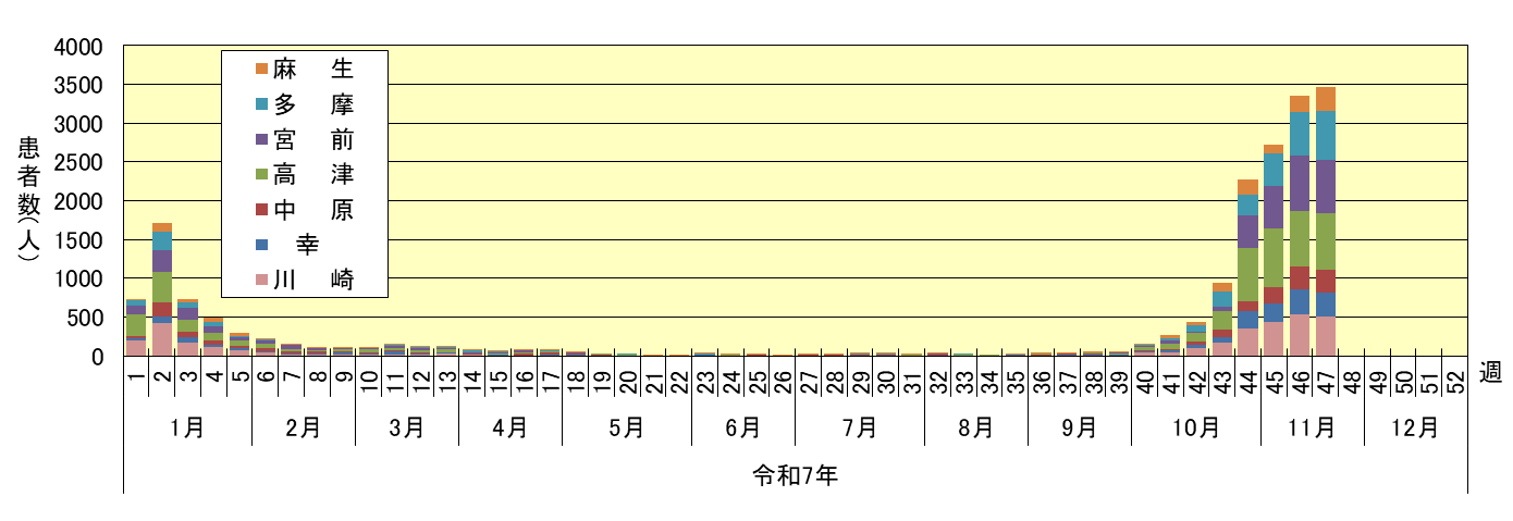 ・令和7年第47週のインフルエンザの患者報告数は3,464人(3,356)でした。区別では、川崎区512人(533)、幸区301人(320)、中原区303人(304)、高津区719人(712)、宮前区692人(708)、多摩区628人(569)、麻生区309人(210)となっています。カッコ内は前週の数値となっています。