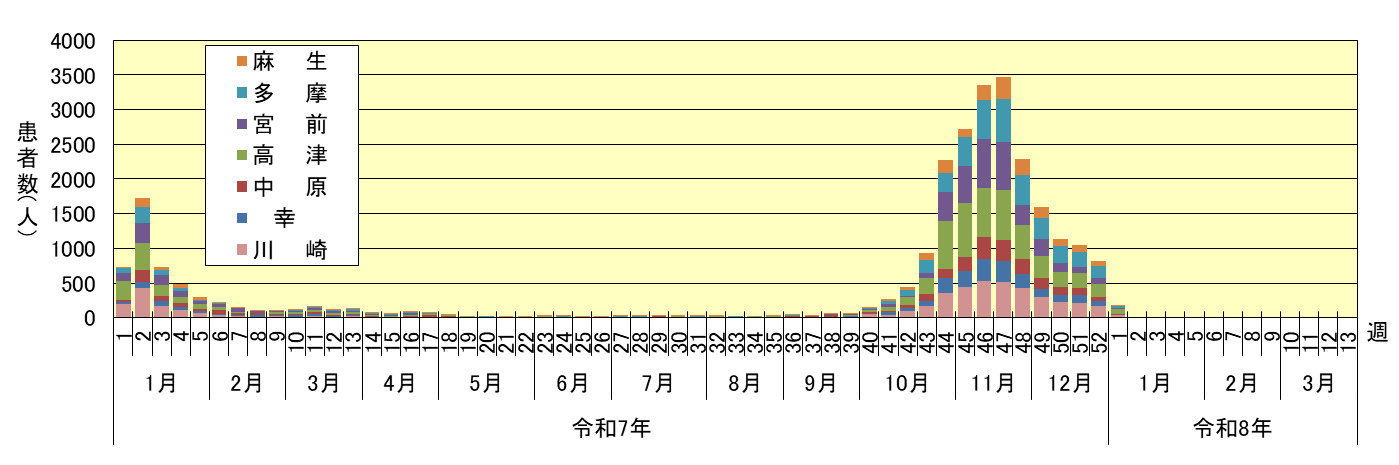 ・令和8年第1週のインフルエンザの患者報告数は180人(820)でした。区別では、川崎区36人(165)、幸区9人(78)、中原区8人(62)、高津区72人(187)、宮前区19人(87)、多摩区26人(163)、麻生区10人(78)となっています。カッコ内は前週の数値となっています。