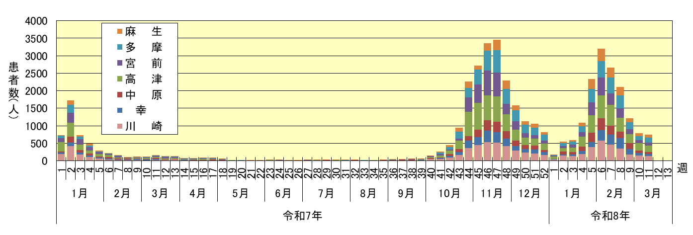 ・令和8年第11週のインフルエンザの患者報告数は748人(784)でした。区別では、川崎区130人(144)、幸区69人(78)、中原区53人(70)、高津区178人(212)、宮前区93人(90)、多摩区135人(115)、麻生区90人(75)となっています。カッコ内は前週の数値となっています。
