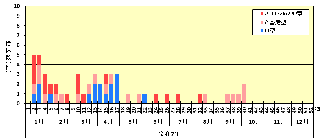 ・令和7年に搬入された検体からは、AH1pdm09型が17件、A香港型が19件、B型が16件検出されています。(令和7年10月16日時点)
