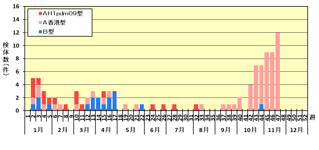 ・令和7年に搬入された検体からは、AH1pdm09型が17件、A香港型が66件、B型が17件検出されています。(令和7年11月27日時点)
