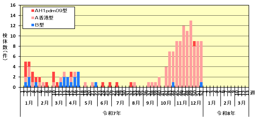 ・令和7年に搬入された検体からは、AH1pdm09型が18件、A香港型が115件、B型が18件検出されています。(令和8年1月7日時点)