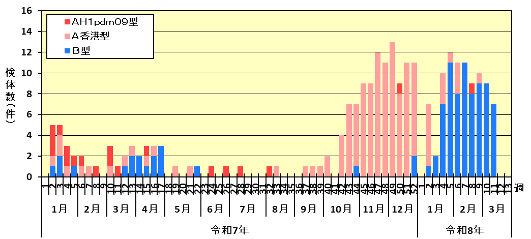 ・令和7年に搬入された検体からは、AH1pdm09型が18件、A香港型が118件、B型が19件検出されています。(令和8年3月18日時点)