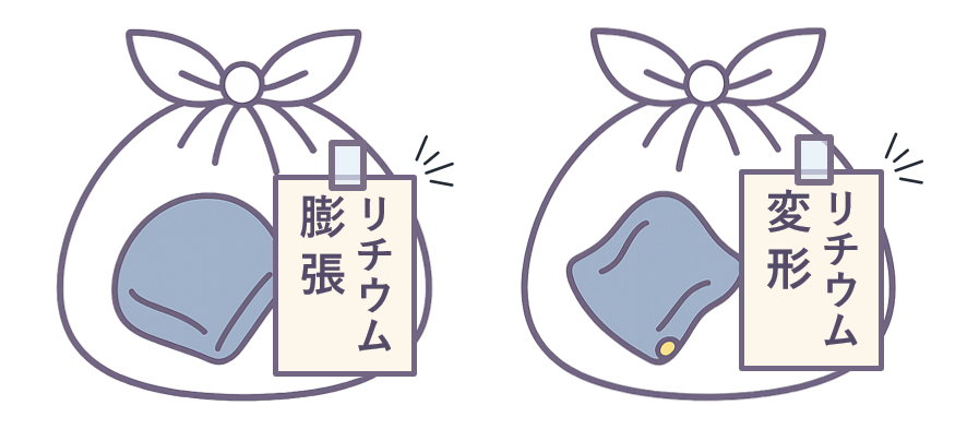 端子部に透明なテープを貼り絶縁し、透明な袋に入れ、「充電池」「リチウム」などと表示。膨張・変形したものは袋を分けて「リチウム変形」などと表示。