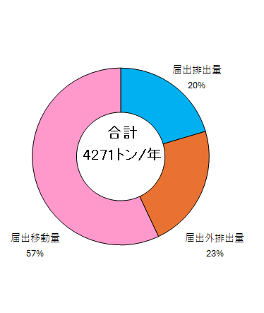 市内の届出排出量・届出外排出量・届出移動量の合計は4,271トンでした。このうち、届出排出量872トン(20%)、届出移動量2,436トン(57%)に対し、届出外排出量は964トン(23%)と推計されています。
