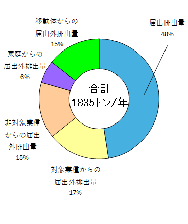 市内の排出量の合計は1,835トンでした。このうち届出外排出量はそれぞれ、対象業種から307トン(17%)、非対象業種から280トン(15%)、家庭から111トン(6%)、移動体から266トン(65%)と推計されています。