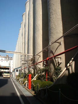 "TSURUMI MILL"の名で海外にも知られる日清製粉鶴見工場(川崎市川崎区大川町)で1926年の操業当初から使われているサイロです。当時の製粉工場は内陸の小麦産地に建てられるのが普通でしたが、同工場は海運による国際化を視野に入れ、外国産小麦を扱うため、日本で最初に港湾部に建設されました。操業開始当時の日産能力(原料小麦挽砕=ばんさい=能力)は290トン。その後、大型サイロや最新鋭の製粉ラインなどが増設され、いまや世界最大規模の工場に成長しました。2002年秋の新ライン稼働時には日産能力2,150トンとなり、これはうどん約1,900万杯分ということです。工場稼動時より本船からの原料荷揚げにニューマチィック・アンローダー(空気吸揚装置)を装備し、当時の130トン2基、時間260トンの能力が、現在は3基、時間830トンに増強されています。