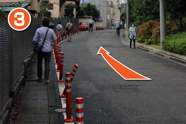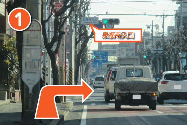 宮前平駅方面のバス停を下りた場合は、バス進行方向と逆に進みます。「東平台」交差点を過ぎ、次の「泉福寺入口」交差点を、渡らずに左折します。
