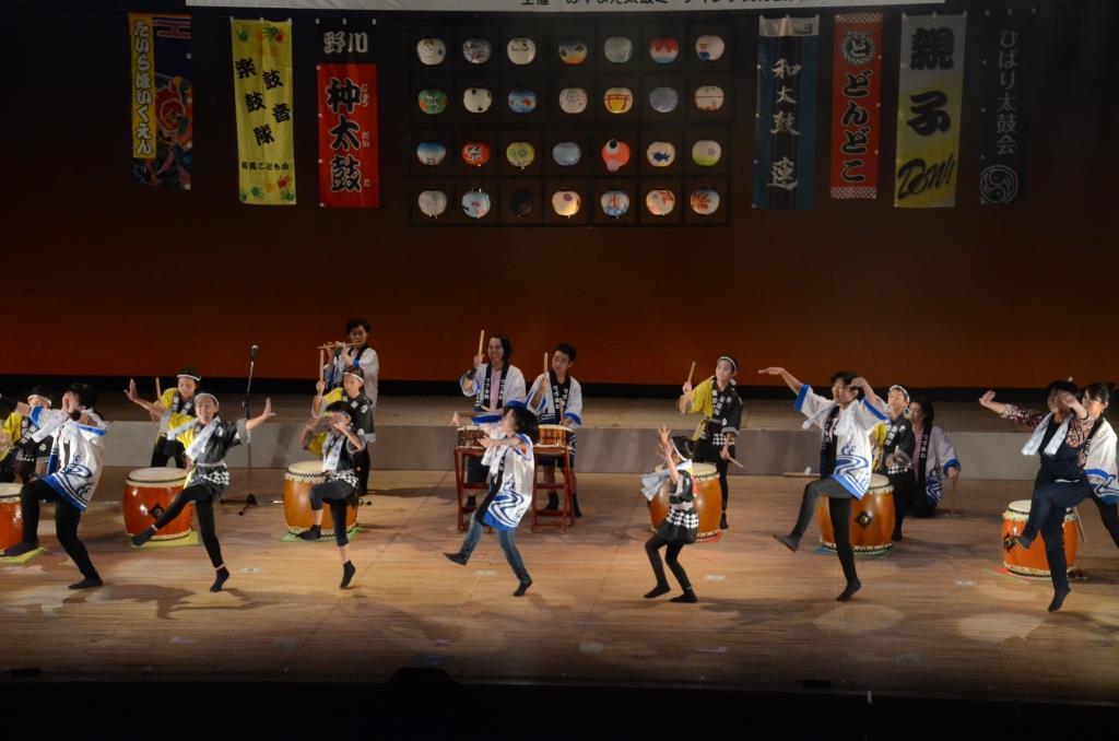 野川親子太鼓 大地。次々と打ち手が代わる演奏で会場を沸かせてくれました。