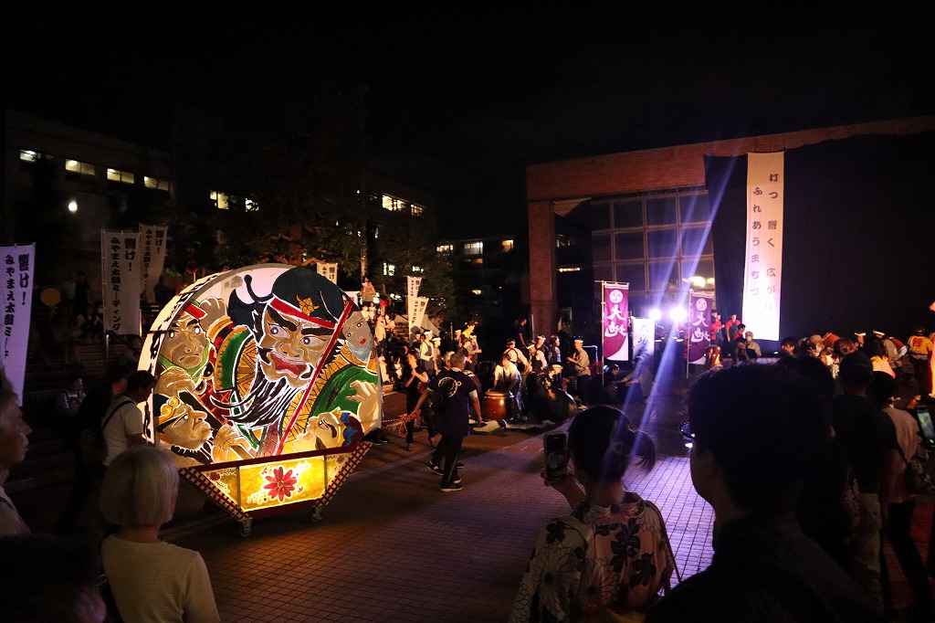 宮崎中美術部制作の宮前ねぷたと、こどものいえもも保育園の荒馬踊りのコラボ。会場も盛り上がります