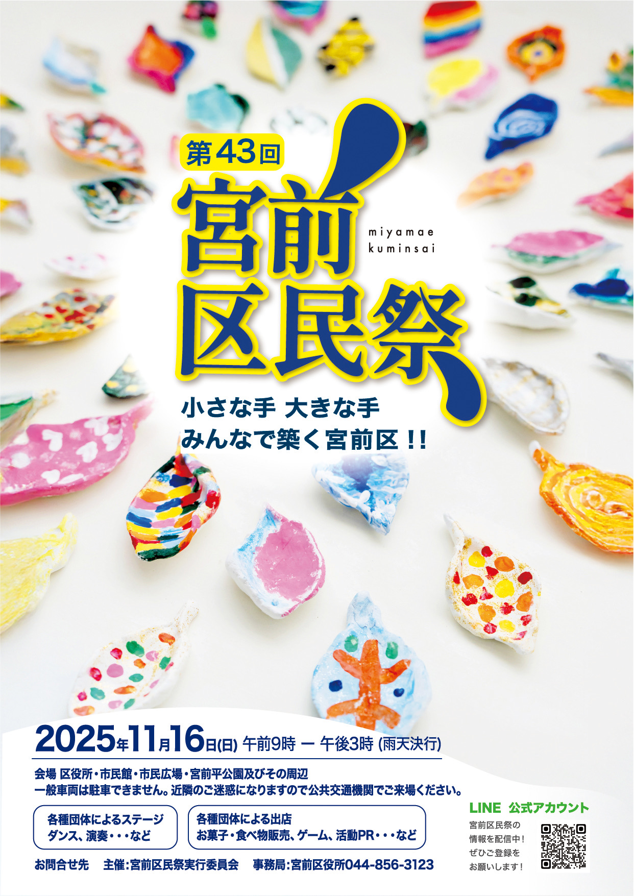 「小さな手 大きな手 みんなで築く 宮前区!!」をテーマに 宮前区秋の一大イベント、宮前区民祭を開催します。