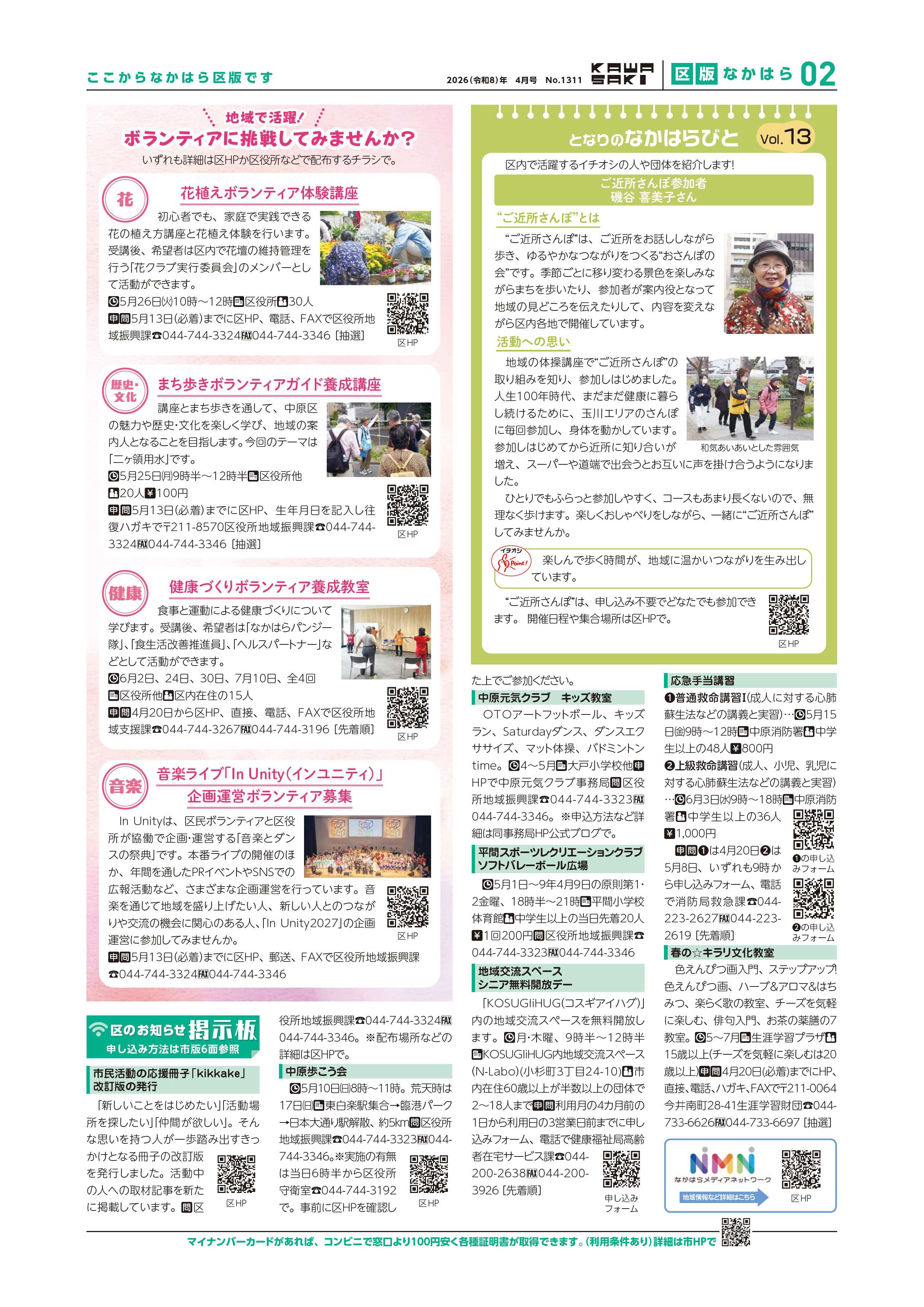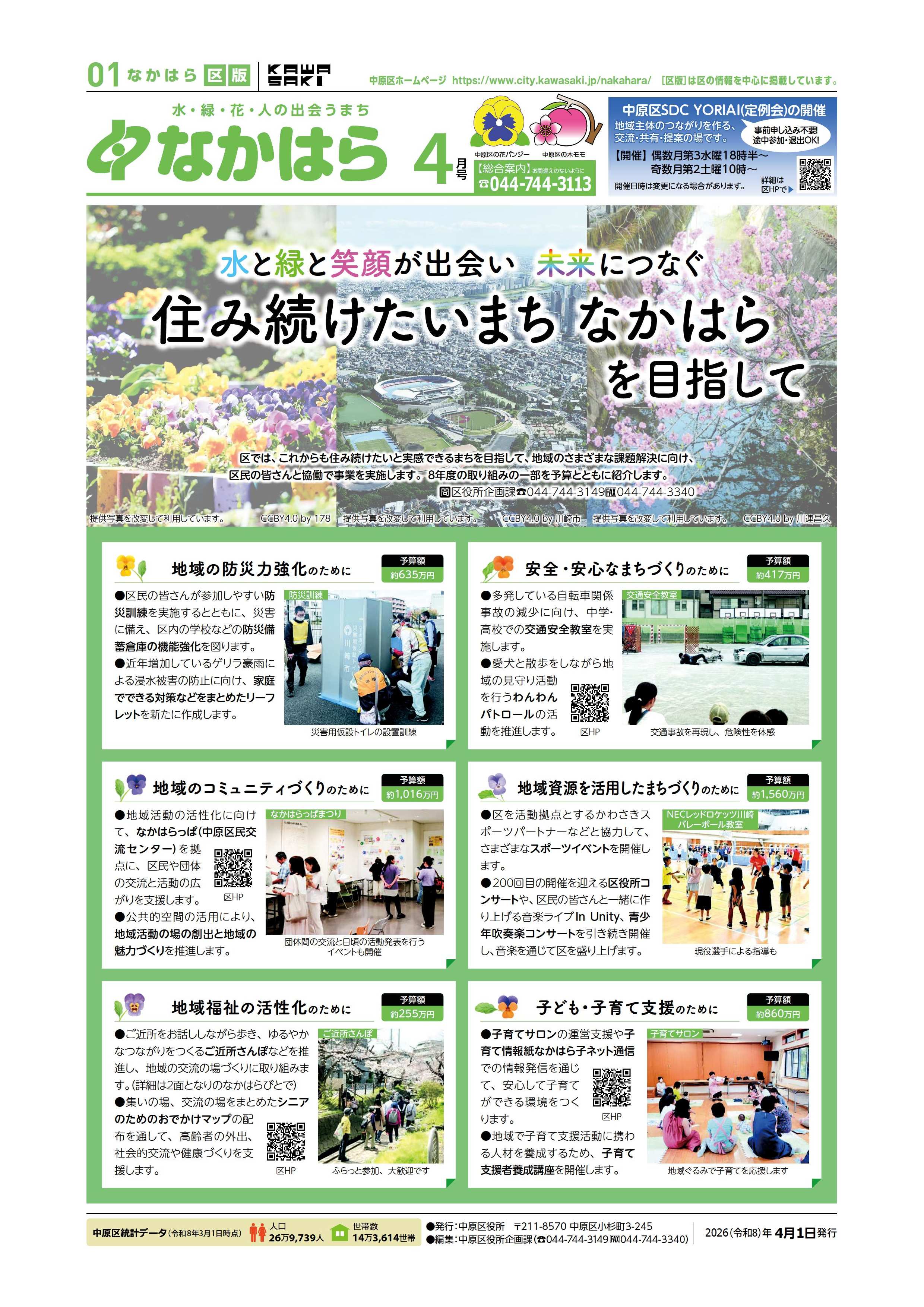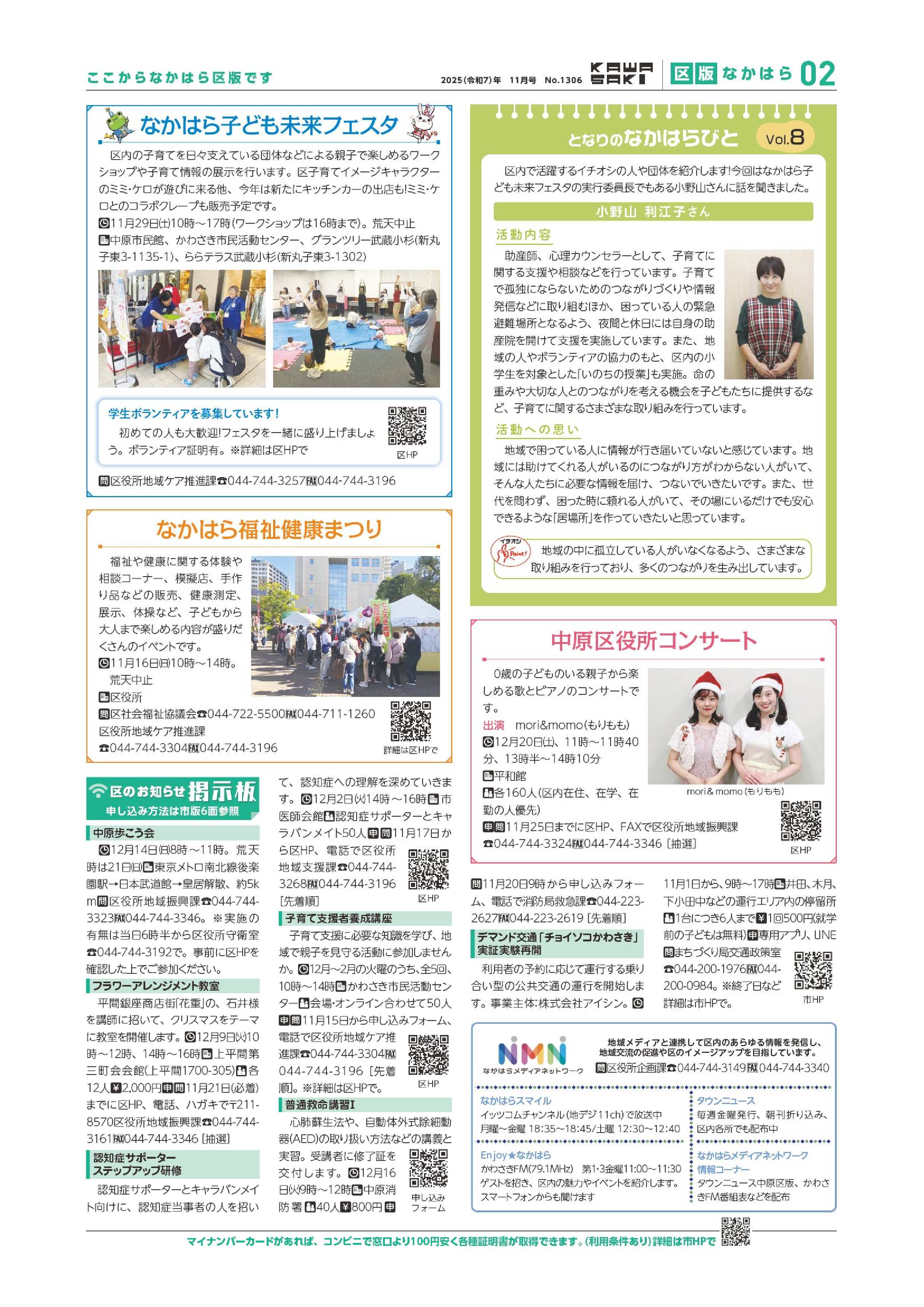 中原区版1、2面は、区内を中心に活動される市民活動の紹介や主な施策及び催し物の情報など、中原区役所が編集してお知らせしています。