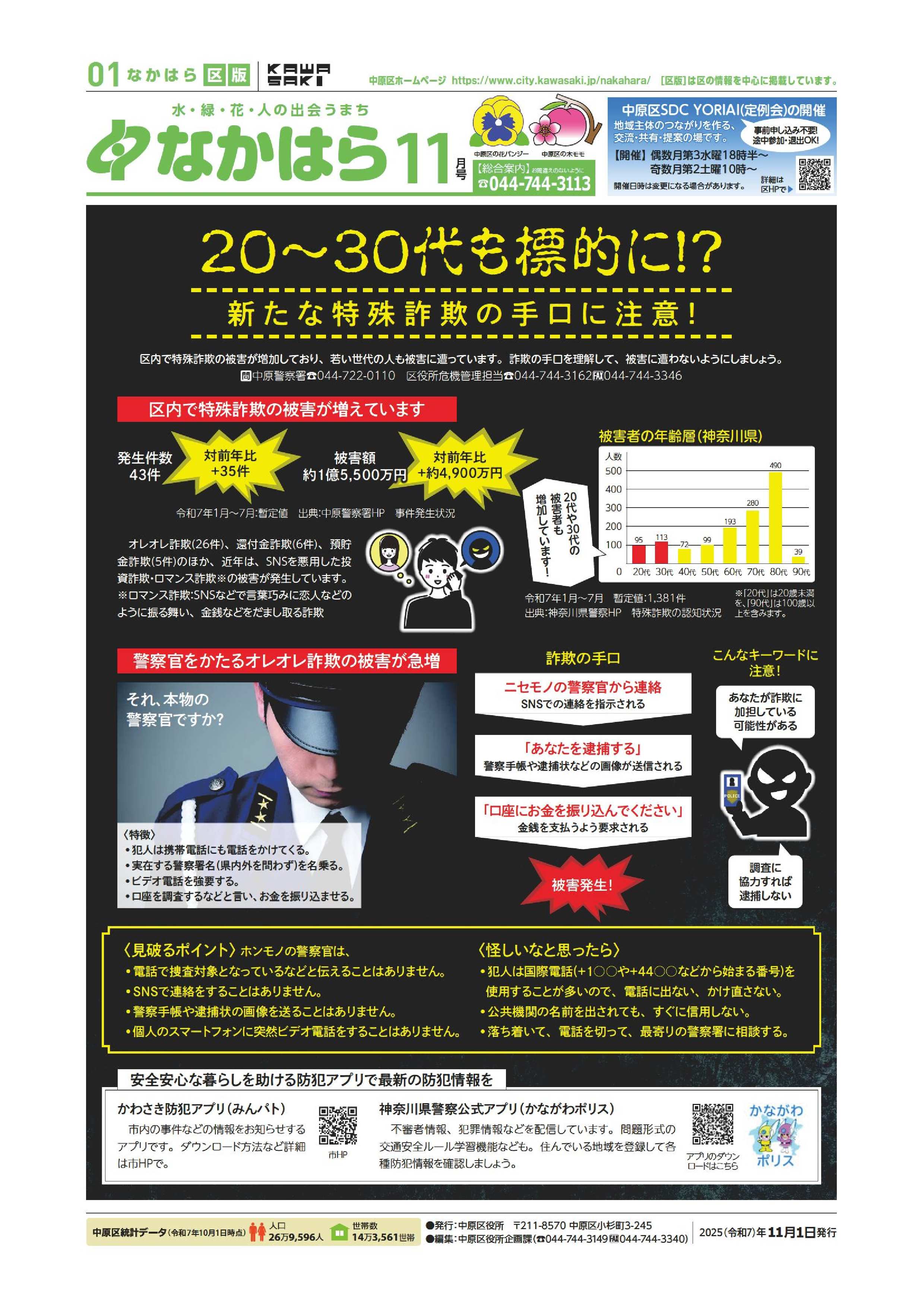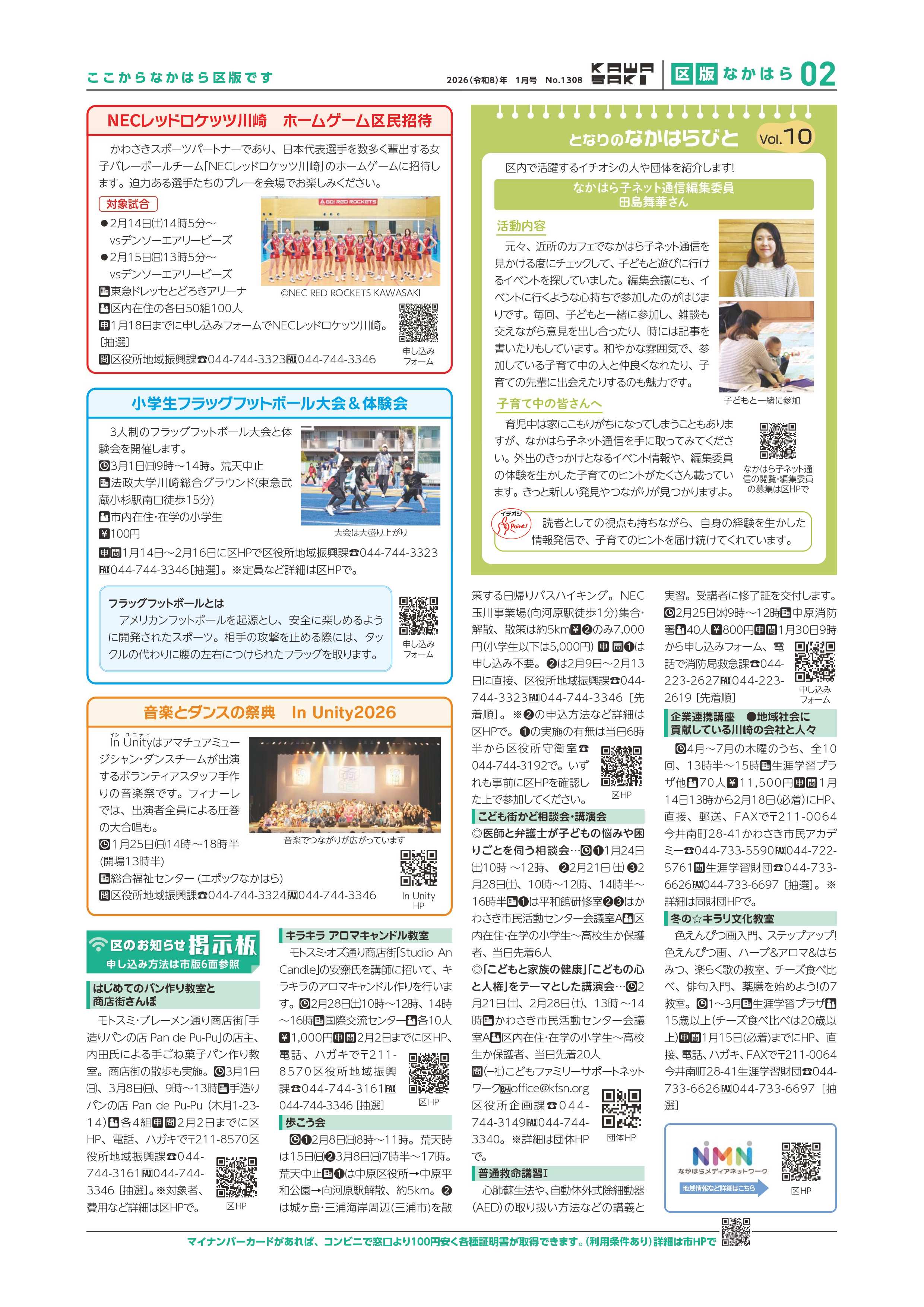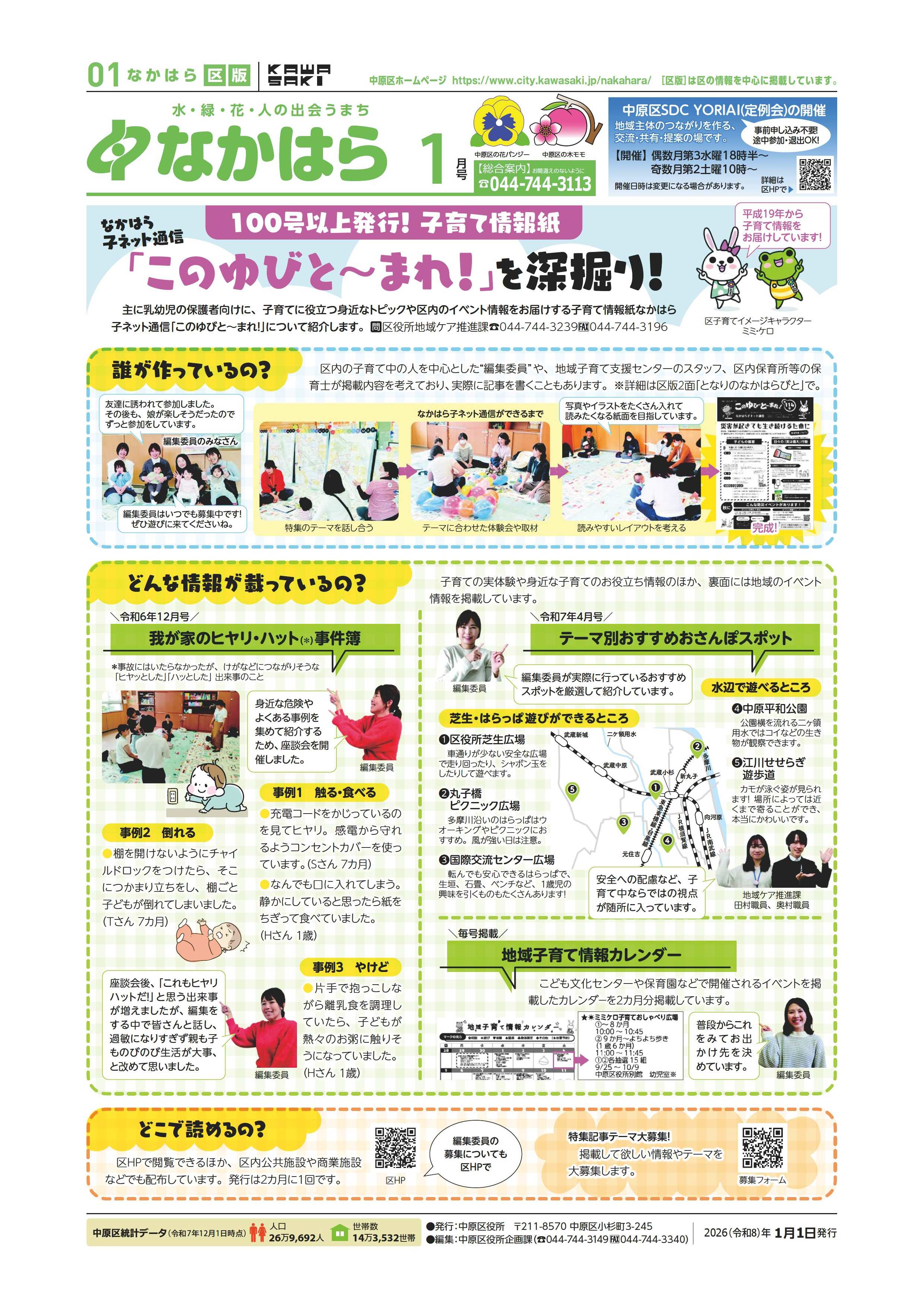 中原区版1、2面は、区内を中心に活動される市民活動の紹介や主な施策及び催し物の情報など、中原区役所が編集してお知らせしています。