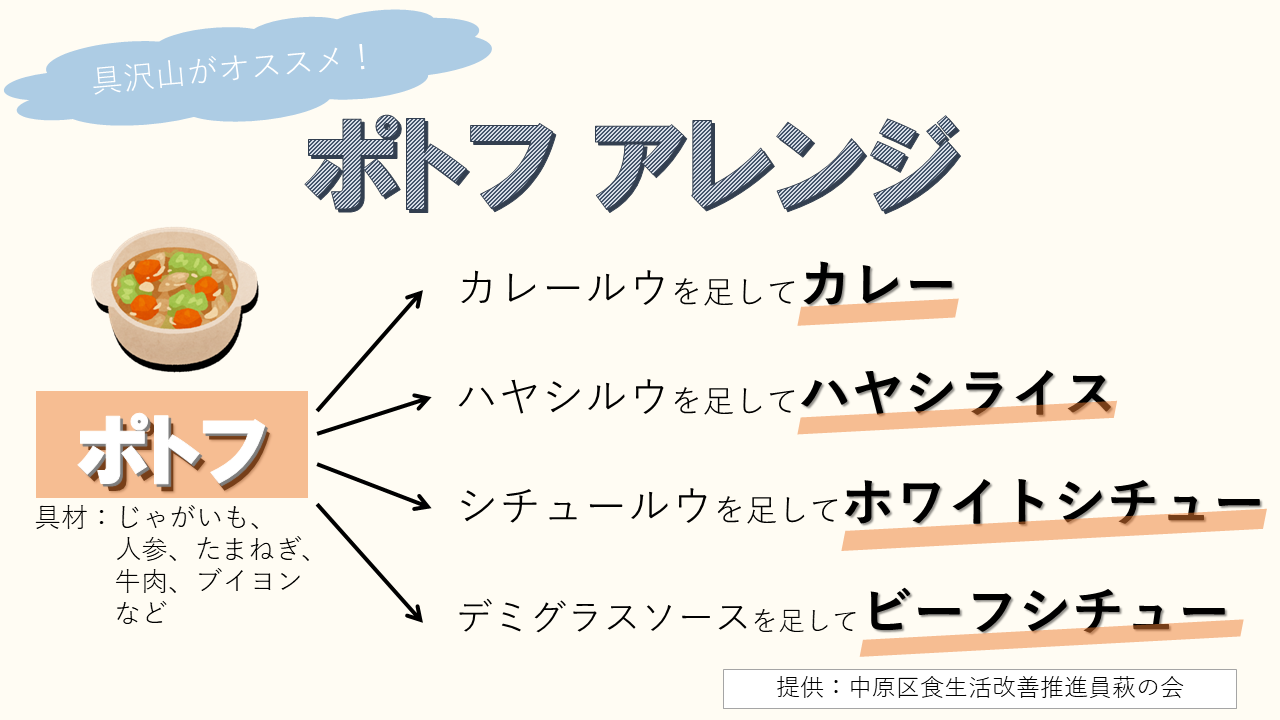 普段の食生活で芋類・海藻類を意識的に取り入れ、より多くの種類の食品を食べられるといいですね。