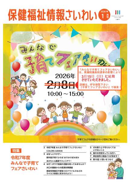 ※1月号1、2頁で御案内しています「みんなで子育てフェアさいわい」は、開催日が3月15日(日)に変更になりました。