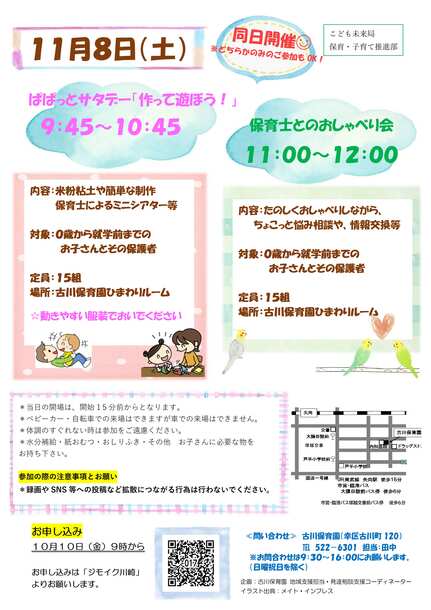 11月は古川保育園、12月は夢見ヶ崎保育園でぱぱっとサタデー!を開催します。