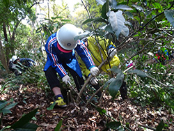 ホタルやトンボが暮らせる環境づくりのため、シラカシ等の間伐とトキワツユクサの抜き取りを行いました。