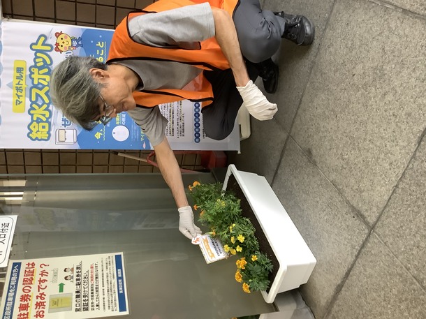 区役所玄関にオレンジ色の花を咲かせたプランターを設置しました。この花はNPO法人マイWayの若年性認知症の当事者の方や認知症サポーター養成講座を受講したボランティアの方が栽培管理をしてくださいました。