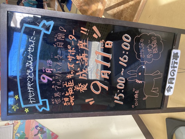 9月11日に梶ヶ谷こども文化センターで認知症キッズサポーター養成講座を実施しました。当日は、47名のこどもたちが参加をしてくれました。最後に「今日からわたしにできること」を考えてもらい「ぼくはおじいちゃんやおばあちゃんを見つけたときやさしくします。」「にんちしょうのひとをみつけたらこえをかける」等素敵な言葉をいただきました。